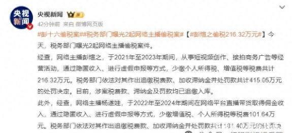 近日,央视新闻曝光了一起网络主播偷税事件,拥有3000多万粉丝的网红彭十六,因偷逃税款216.32万元被税务部门追缴并处罚款415.05万元,同时其全平台账号被禁言。